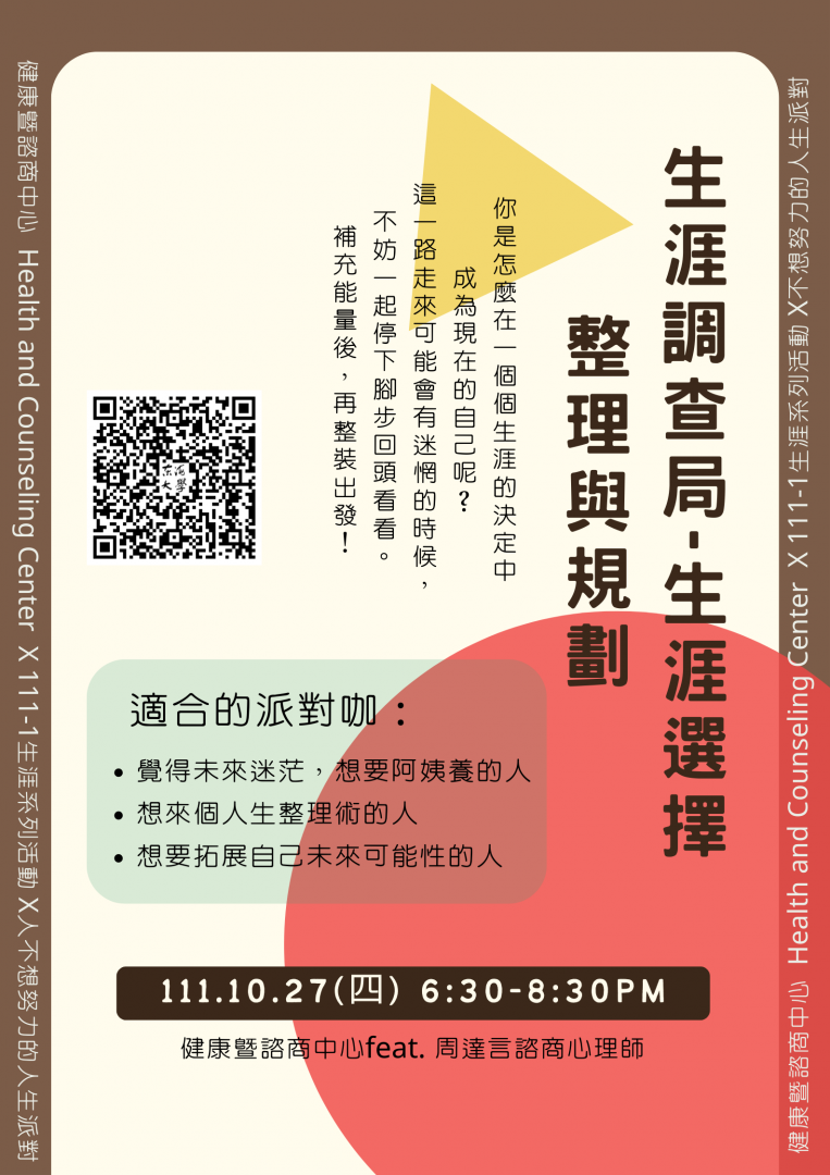 111.10.27(四)6:30-8:30 生涯調查局-生涯選擇整理與規劃