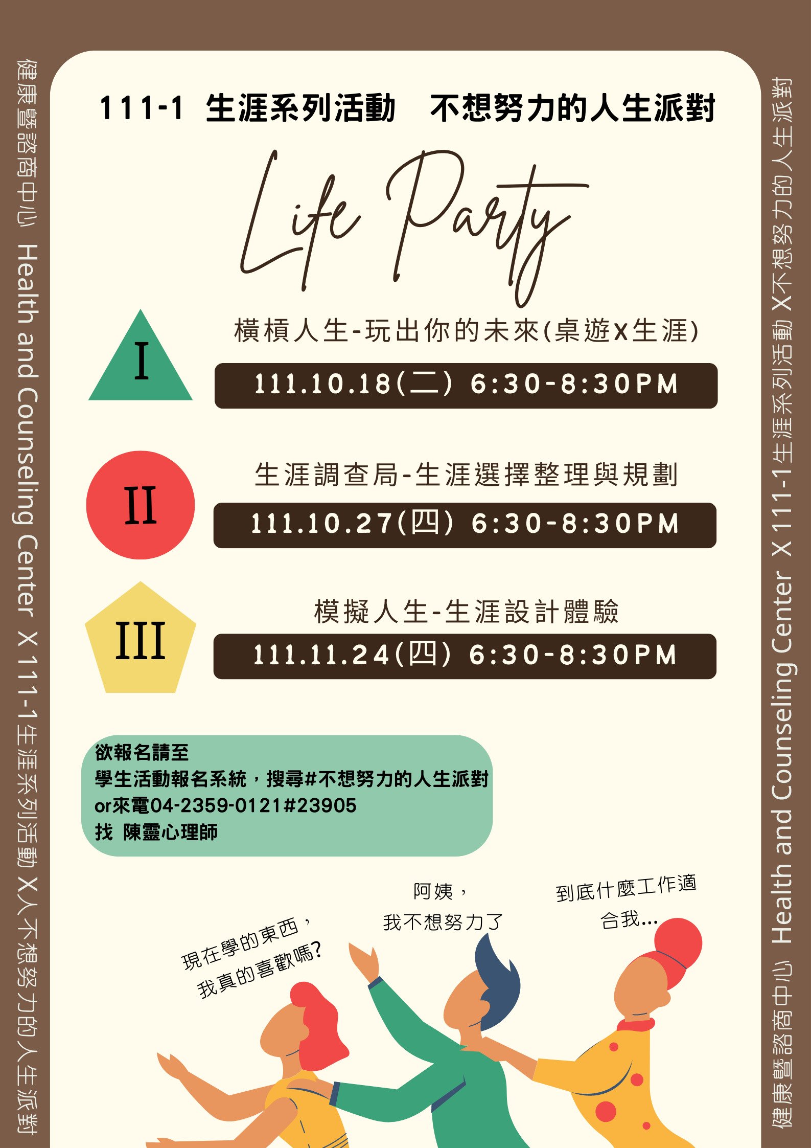 健康暨諮商中心本學期於 10-11月辦理 3場生涯系列講座-《不想努力的人生派對》