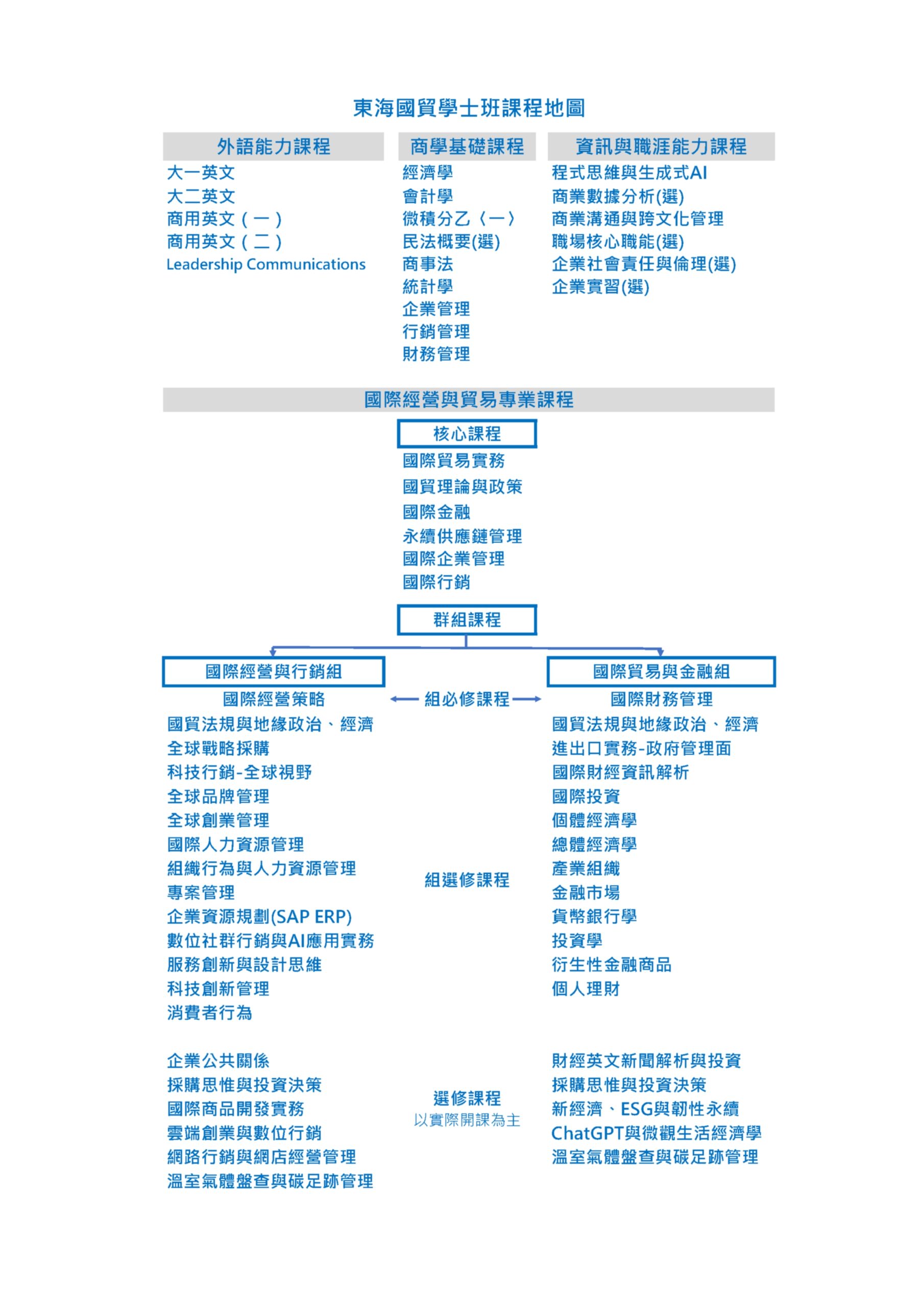 -選修課程學分數應大於或等於 35 學分數。(其中至少選修「國際貿易與金融組」5科組選修課程或選修「國際經營與行銷組」5科組選修課程;且組選修科目限為本系所開設之課程)
